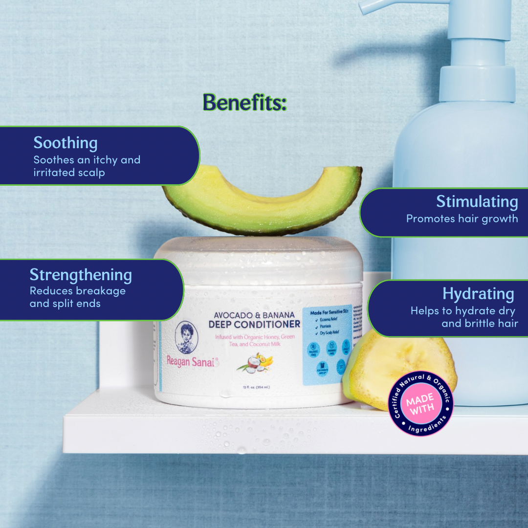 Finally an all natural deep conditioner for kids with natural hair! Transform dry strands with our special blend of avocado, banana, coconut milk, and certified organic honey. Our Avocado & Banana Deep Conditioner is hair mask designed to penetrate and smooth dry strands with a nutrient-rich fortifying formula. Our custom recipe is high in potassium; which helps to strengthen, moisturize, and provide fatty acids to help resist breakage in your child’s hair. Be prepared to bathe your son or daughter’s tresses in this invigorating hair goodness.